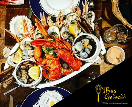 Schaaldierenboot met assortiment volgens de vangst van de dag. Met halve kreeft per persoon, rouille, citroen en brood.
